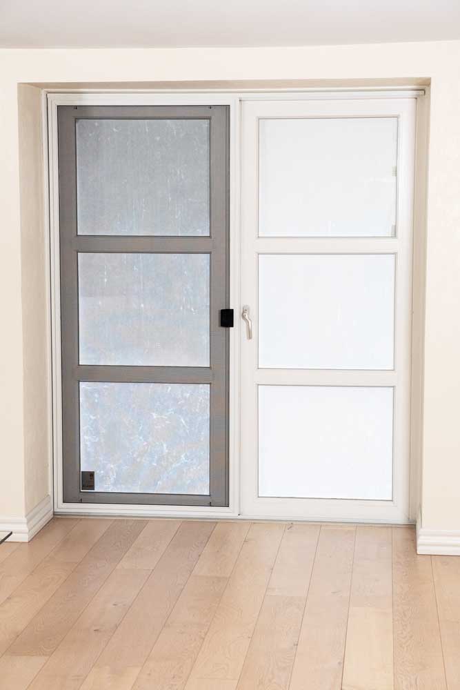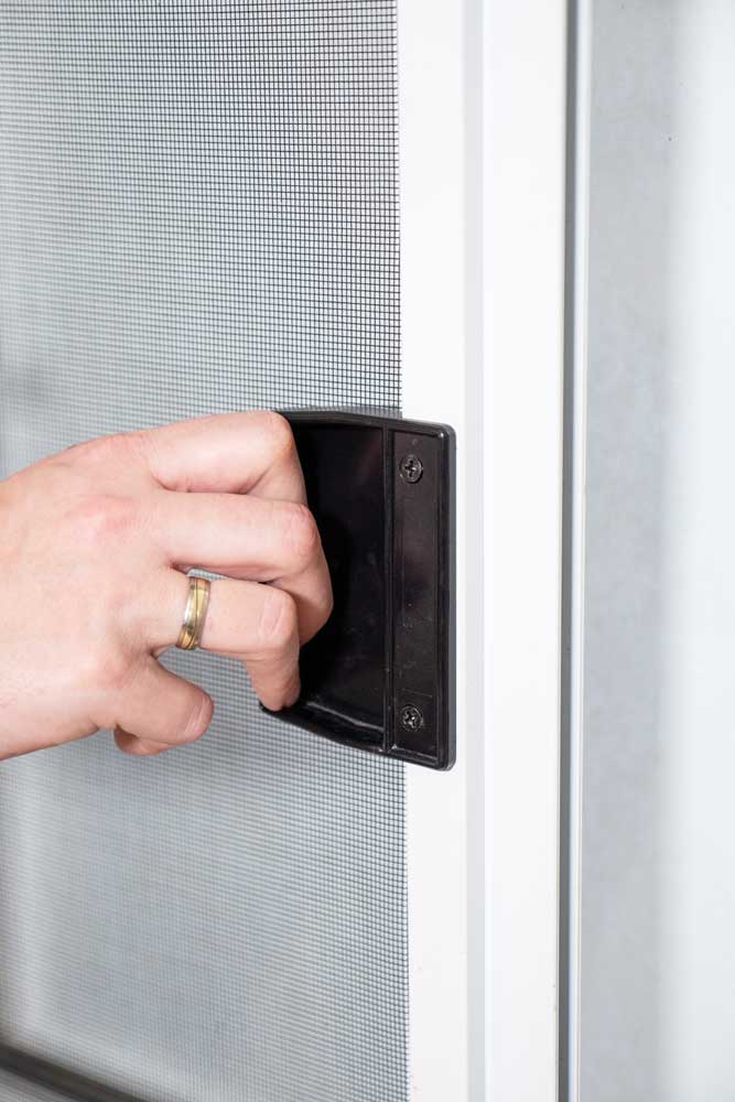 Skydedøren med insektnet kan som standard leveres i hvid, sort eller brun, så den matcher karmen, med køreskinner i bund og top.