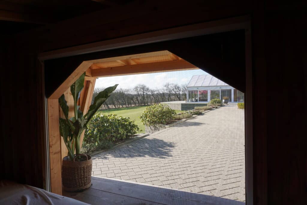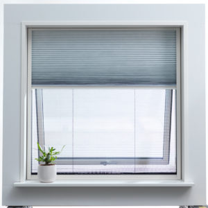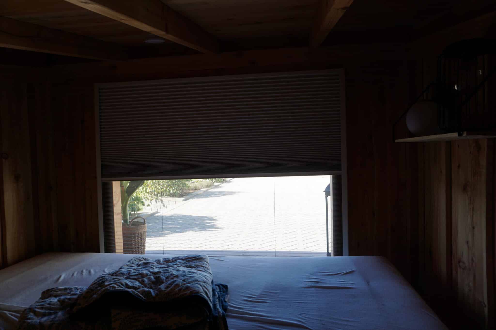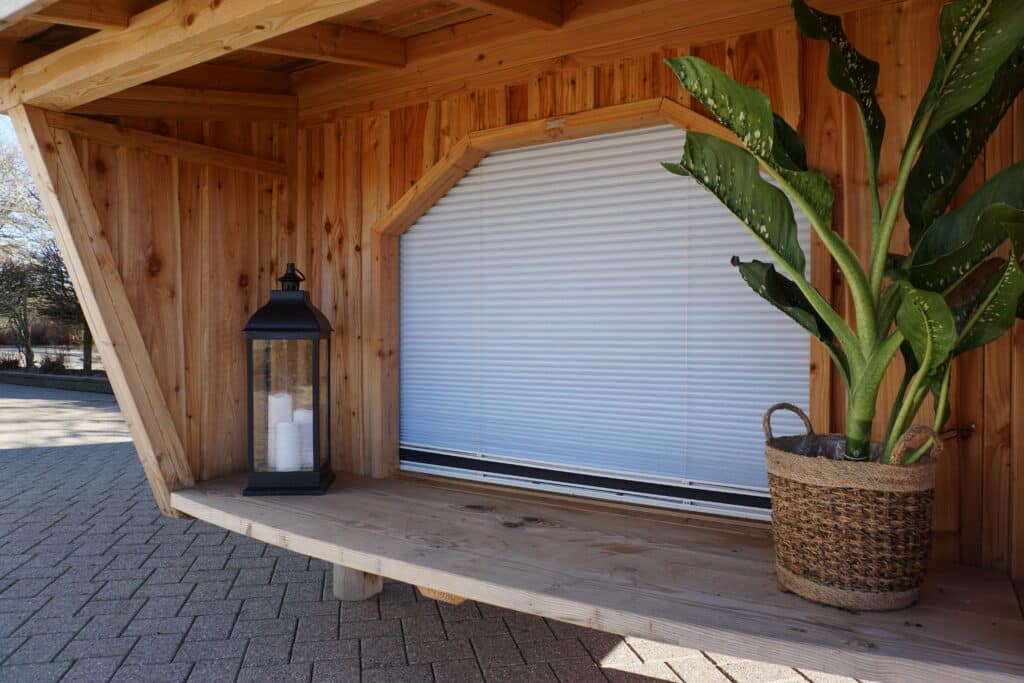 OBS! Mørklægningsdelen af vores DUO-plissé er lufttæt. Du må kun rulle mørklægningen helt for og sove i shelteret, hvis der er anden udluftning. Er dit shelter “utæt” fordi der er huller mellem brædderne eller lignende naturlig udluftning, så er det ganske fint – men så bliver det til gengæld svært for vores insektnet at holde myg og andet kravl ude.
