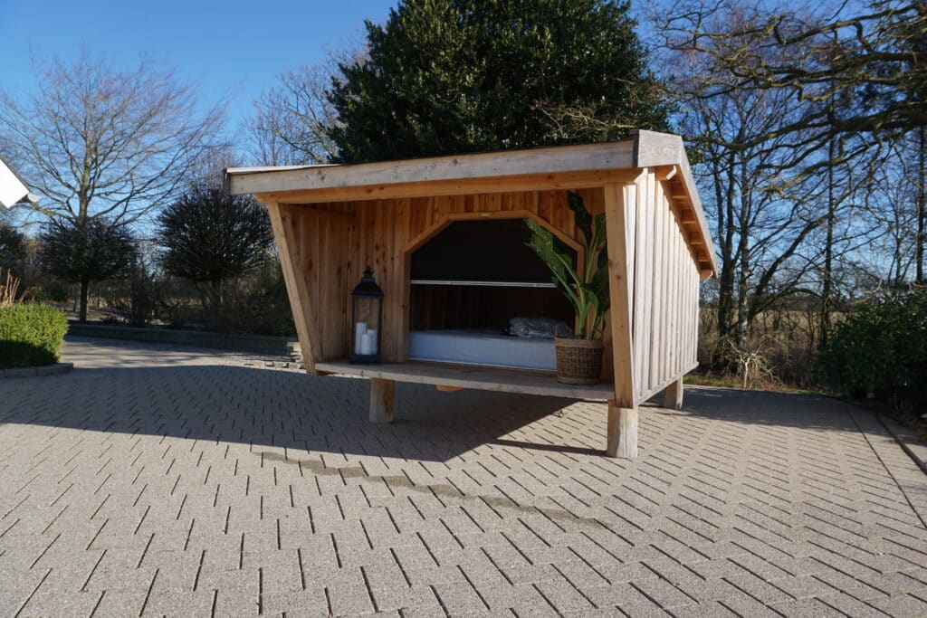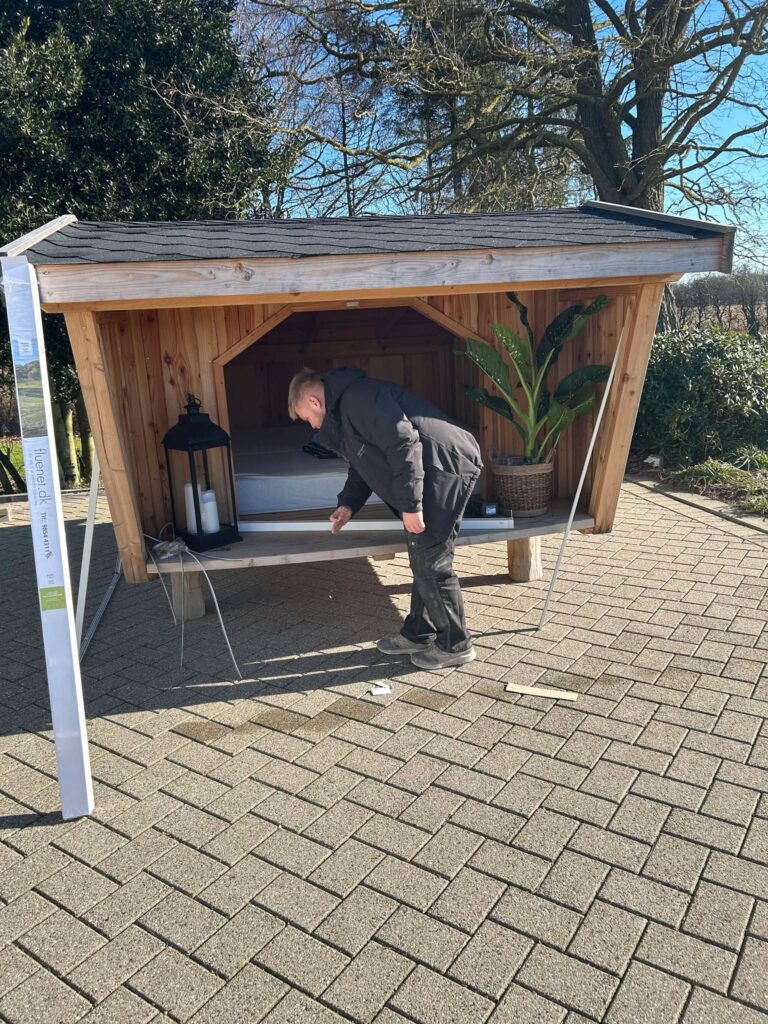 Shelteret vi har fået opstillet er et “Grønagergård Shelter” fra Grønagergård Savværk i Gjern, men vores net kan tilpasses de fleste sheltere, så længe der er en indvendig åbning som på denne model – ellers kan det godt blive svært at finde et passende sted til montering.