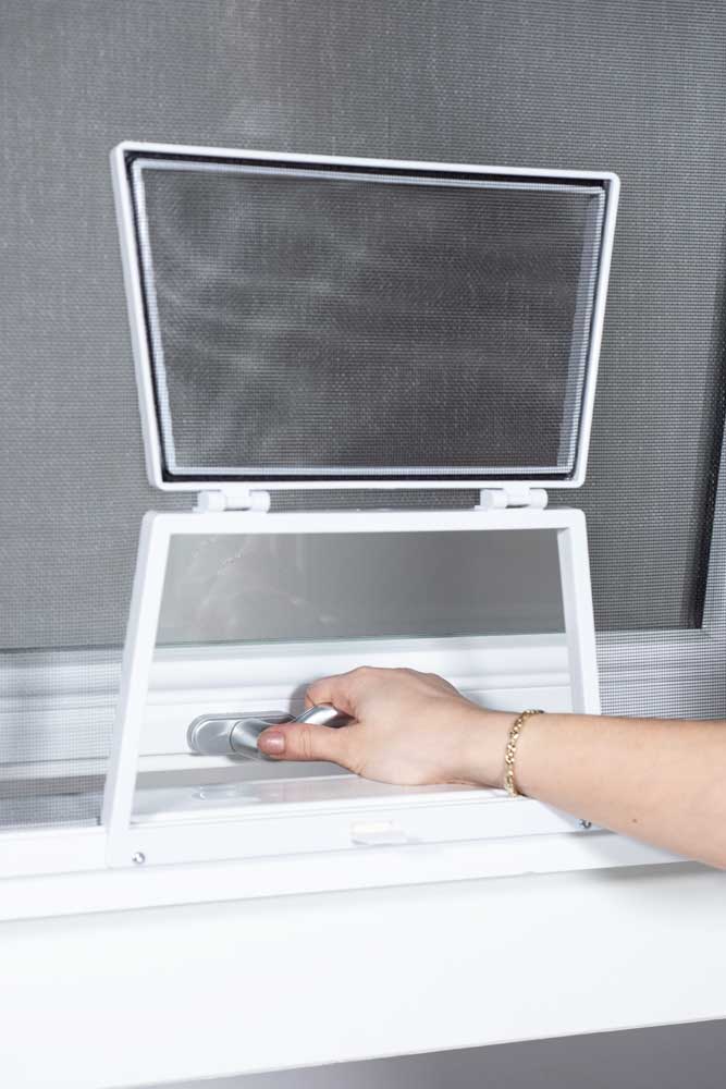 Ved sidehængte vinduer monteres én faste rammer i en køreskinne indenfor. Rammen kan let køres til side, når vinduet skal betjenes eller fjernes helt ved rengøring.